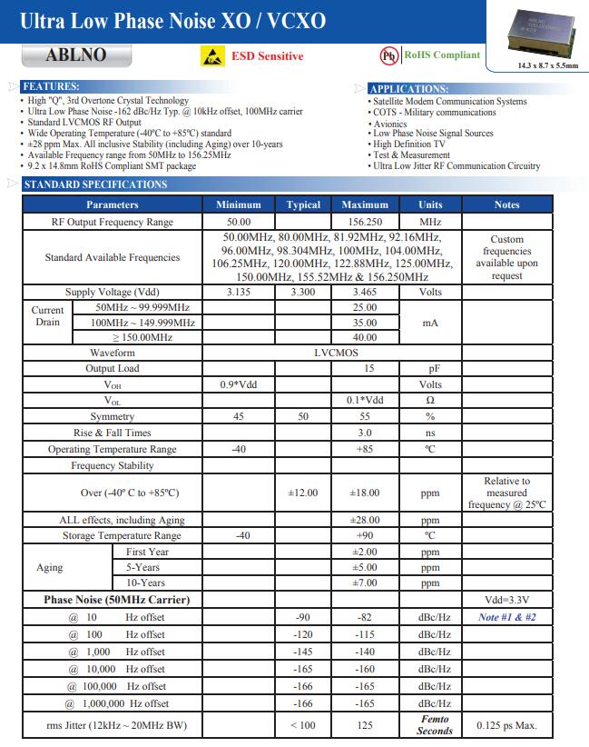 ABRACON旗艦ABLNO系列提供超低相位噪聲固定時(shí)鐘或電壓控制晶體振蕩器(VCXO)解決方案標(biāo)準(zhǔn)尺寸為9x14mm。同超過(guò)12 kHz的37fs典型RMS抖動(dòng)20MHz帶寬@ 100MHz載波,ABLNO是性能驅(qū)動(dòng)的理想選擇通訊,射頻,無(wú)線回程,和儀器應(yīng)用。