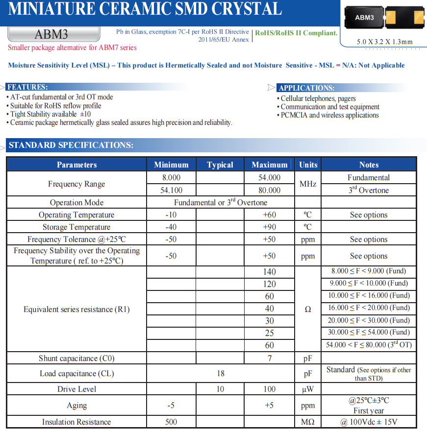 ABM3-24.576MHZ-B2-T,18PF,20PPM,24.576MHz,ABRACON,5032,歐美艾伯康晶振公司,水分敏感度水平(MSL)-本產品為密封密封且不對水分敏感- MSL = N/A:不適用,AT-cut基礎或第三OT模式適用于RoHS回流輪廓緊穩(wěn)定性可用±10陶瓷包裝密封玻璃密封,確保高精度和可靠性,蜂窩電話、尋呼機、通信和測試設備、PCMCIA和無線應用