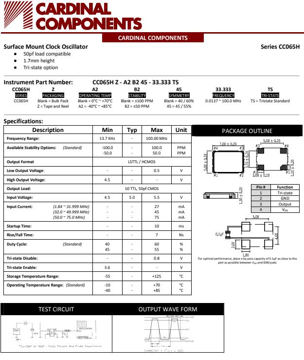 更多>>美國卡迪納爾晶振,CC065H石英晶體振蕩器,CC065HZ-A2B240-26.000TS晶振