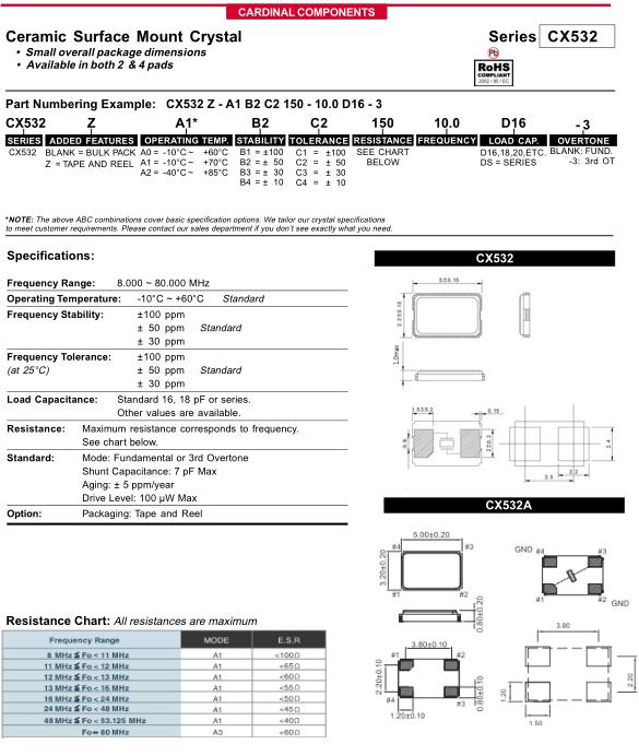 更多>>美國Cardinal晶振,CX532A無源晶體諧振器,CX532AZ-A2B4C4150-10.0D16-3晶振
