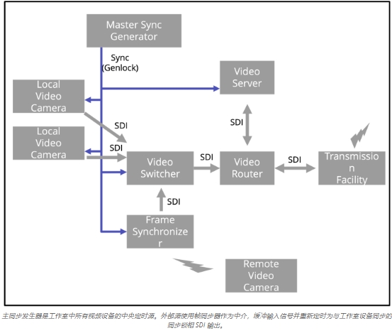專業(yè)攝像機是工作室制作的核心,其性能依賴于精確的同步。以下是同步在典型攝像機設置中的級聯(lián)方式: