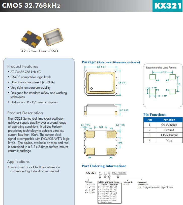 亞陶晶振KX321系列,編碼KX3211E0032.768000,實(shí)時(shí)時(shí)鐘振蕩器在廣泛的工作條件下實(shí)現(xiàn)了卓越的穩(wěn)定性。電源電壓1.8V/2.5V/3.3V,頻率32.768kHz,CMOS晶體振蕩器,它利用Pericom專有技術(shù)實(shí)現(xiàn)小于10μA的超低電流。輸出時(shí)鐘信號與LVCMOS/LVTTL邏輯電平兼容。該器件采用卷帶包裝,小體積晶振尺寸采用3.2x2.5mm表面貼裝陶瓷封裝。
