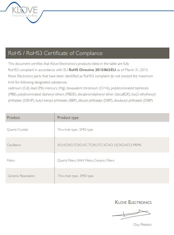該表格證明列出的Klove Electronics產(chǎn)品完全符合歐盟RoHS指令2015/863/EU的要求(限制在電氣和電子設(shè)備中使用某些有害物質(zhì)- RoHS3)。