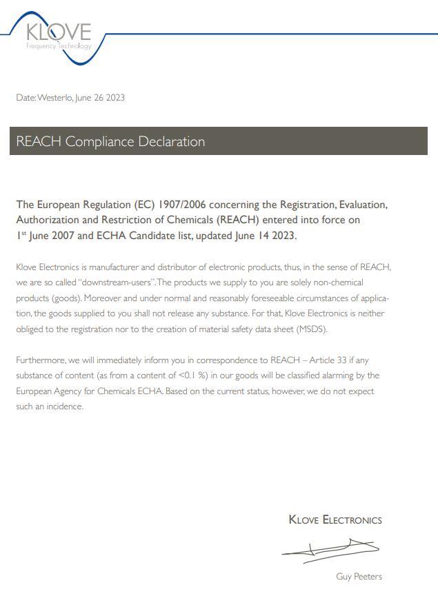Klove Electronics是電子產(chǎn)品的制造商和經(jīng)銷商,因此,在REACH的意義上,我們被稱為“下游用戶”。我們向您提供的產(chǎn)品僅為非化工產(chǎn)品(商品)。此外,在正常和可合理預(yù)見的應(yīng)用環(huán)境下,提供給貴方的貨物不應(yīng)釋放任何物質(zhì)。為此,Klove Electronics既沒有義務(wù)進(jìn)行注冊,也沒有義務(wù)創(chuàng)建材料安全數(shù)據(jù)表(MSDS)。