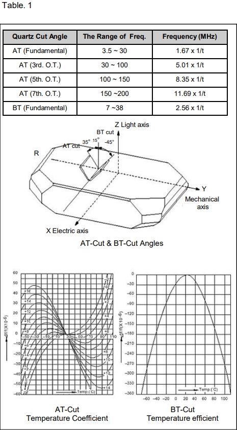 -晶體的“頻率穩(wěn)定性”主要是由于石英棒以一定的預(yù)先定向角度切割成晶圓所致。今天最流行和廣泛使用的是AT-Cut。AT切割的切割角度約為35X15',z軸在負(fù)y軸方向,與在Y軸正方向上與Z軸成-45度角 BT-cut。為了便于理解,兩者的圖形切割如下所示。一般來(lái)說(shuō),BT切割毛坯比AT切割毛坯厚,所以更高的頻率可以 使用BT切割實(shí)現(xiàn)。AT-cut和BT-cut的一個(gè)主要區(qū)別是頻率穩(wěn)定特性,另請(qǐng)參考兩個(gè)切口的溫度系數(shù)曲線表1。