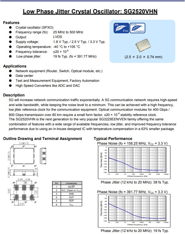 愛普生晶振SG2520VHN是非常受歡迎的SG3225EEN/VEN系列的下一代產(chǎn)品,提供相同的功能組合,具有廣泛的可用頻率、低抖動和更高的頻率容差性能,因為它采用了內(nèi)部設(shè)計的溫度補償IC,封裝尺寸減小了63%。SG2520VHN有源晶振支持LVDS輸出差分晶振,工作溫度可達到-40℃至+105℃,電源電壓1.8V至3.3V,寬頻率范圍25MHz至500MHz任意一頻點具有低電源電壓,滿足產(chǎn)品低消耗電流特點,具有超小型,輕薄型,低電源電壓,低抖動,低功耗,低損耗,低耗能,低相位噪聲等特點,被廣泛用于通訊設(shè)備,機頂盒,光端機,安防設(shè)備及各種頻率控制設(shè)備上。 應用于5G網(wǎng)絡(luò)設(shè)備專用晶振X1G005941000215,X1G005941001115,差分晶振