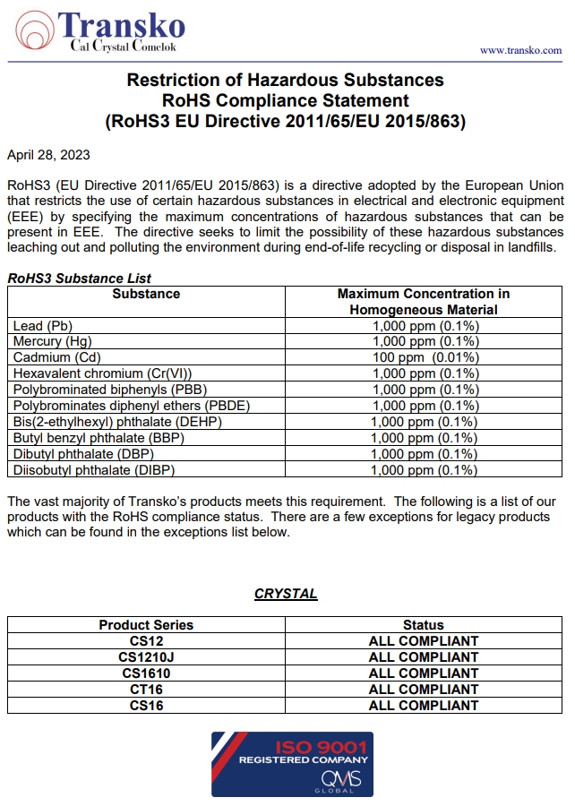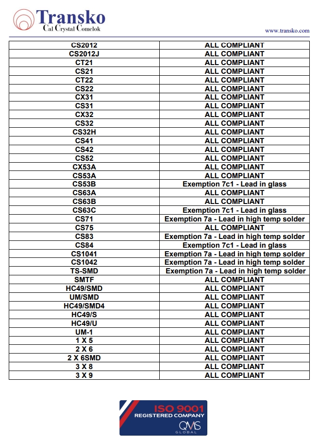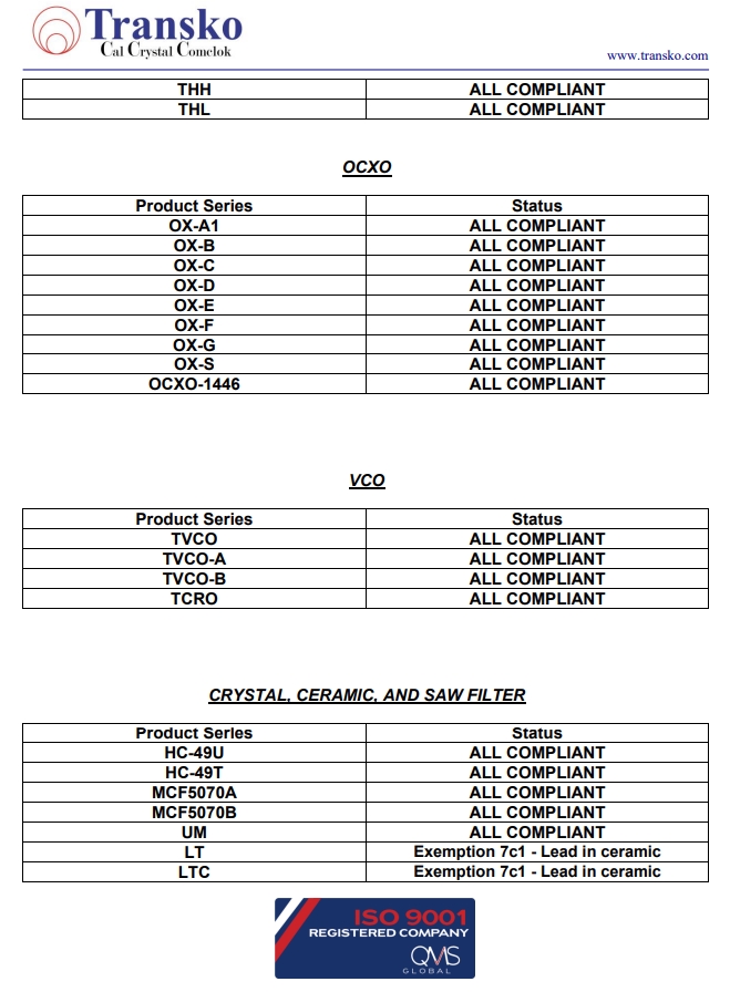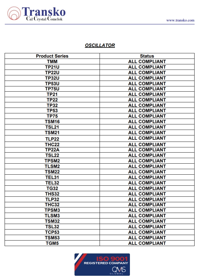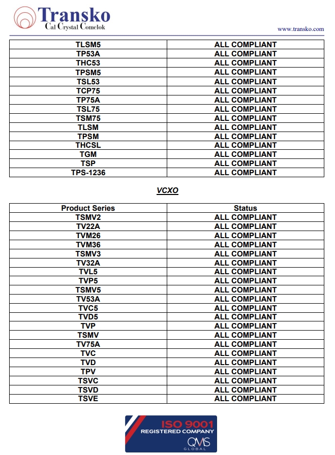 Transko Electronics, Inc.是一家領(lǐng)先的ISO 9001認證的電子行業(yè)頻率控制產(chǎn)品制造商,實施質(zhì)量體系已滿足國家和國際質(zhì)量體系的要求的需要。一直以來,Transko晶振的質(zhì)量體系都持續(xù)符合ISO 9001的要求并不斷提高質(zhì)量管理體系的有效性。提供優(yōu)質(zhì)的產(chǎn)品和服務(wù)是Transko Electronics, Inc.的既定政策,始終如一地滿足客戶的需求,實現(xiàn)了領(lǐng)先同行的高質(zhì)量環(huán)保生產(chǎn)標(biāo)準(zhǔn)。