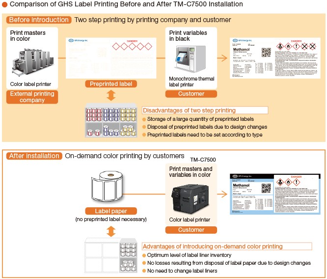 首先,他們會(huì)要求外部印刷承包商在GHS標(biāo)準(zhǔn)指定的地方制作多種預(yù)印標(biāo)簽,以顯示公司徽標(biāo)和圖案符號(hào)的紅色菱形.然后,使用他們自己的條形碼標(biāo)簽軟件,他們將使用單色熱敏標(biāo)簽打印機(jī)打印預(yù)打印標(biāo)簽上每種化學(xué)品的條形碼,產(chǎn)品信息和圖片符號(hào).因此,我們發(fā)現(xiàn)客戶面臨以下問(wèn)題.