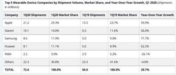 據(jù)外媒報道,市場研究機構(gòu)IDC日前發(fā)布全球可穿戴設(shè)備季度跟蹤報告的最新數(shù)據(jù),顯示全球可穿戴設(shè)備出貨量在2020年第一季度達到7260萬部,同比增長29.7%.其中,蘋果仍然遙遙領(lǐng)先,可穿戴設(shè)備獨占近三成市場份額.
