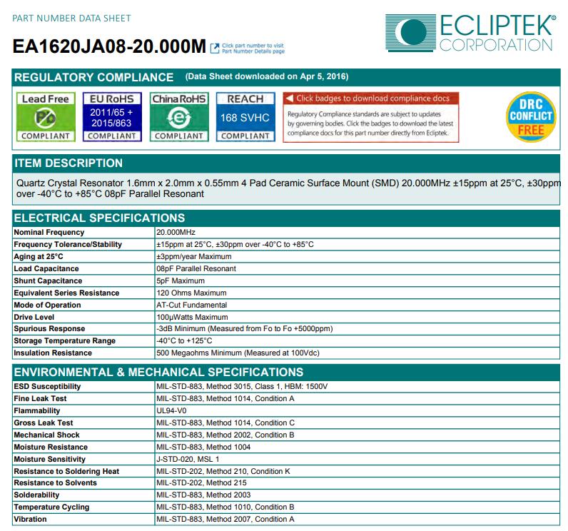 日蝕晶振,EA1620JA08-20.000M晶振,2016mm晶振本身體積小,超薄型石英晶體諧振器,特別適用于有目前高速發(fā)展的高端電子數(shù)碼產(chǎn)品,因為晶振本身小型化需求的市場領域,小型?薄型是對應陶瓷諧振器(偏差大)和普通的石英晶體諧振器(偏差?。┑闹虚g領域的一種性價比較出色的產(chǎn)品.產(chǎn)品廣泛用于筆記本電腦,無線電話,衛(wèi)星導航HDD, SSD, USB, Blu-ray等用途,符合無鉛焊接的高溫回流焊曲線特性.