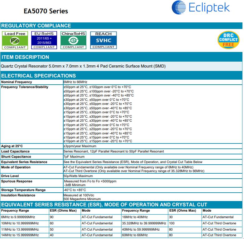 | EA5070MA20-6.000M | AT-Cut Fundamental | SMD Ceramic 5.0mm x 7.0mm | ±15ppm | -40°C to +85°C | ±3ppm | 7pF Maximum |