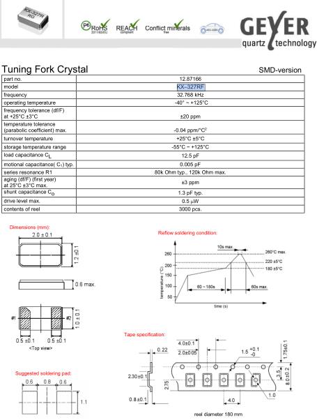 德國GEYER晶振,KX-327RT石英晶振,綠色環(huán)保晶振,貼片表晶32.768K系列具有超小型,薄型,質(zhì)地輕的表面貼片音叉型石英晶體振蕩器,貼片晶振產(chǎn)品本身具備優(yōu)良的耐熱性,耐環(huán)境特性,在辦公自動化,家電領(lǐng)域,移動通信領(lǐng)域可發(fā)揮優(yōu)良的電氣特性,符合無鉛標(biāo)準(zhǔn),滿足無鉛焊接的回流溫度曲線要求,金屬外殼的石英晶振使得產(chǎn)品在封裝時能發(fā)揮比陶瓷晶振外殼更好的耐沖擊性能.