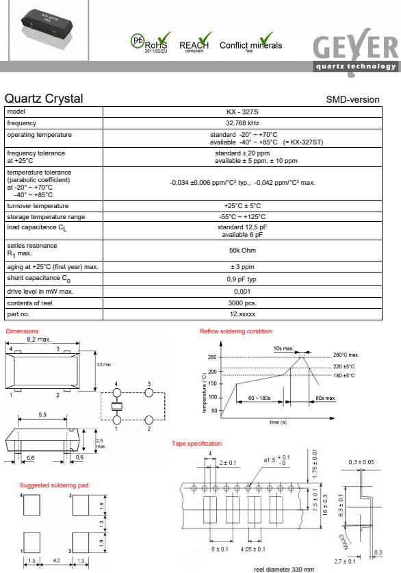 GEYER格耶晶振,KX-327S無源晶體,8038mm貼片晶振,32.768KHZ晶振時鐘晶體具有小型,薄型,輕型的貼片晶振表面音叉型晶體振蕩器,產(chǎn)品具有優(yōu)良的耐熱性,耐環(huán)境特性,可發(fā)揮晶振優(yōu)良的電氣特性,符合RoHS規(guī)定,滿足無鉛焊接的高溫回流溫度曲線要求,金屬外殼的封裝使得產(chǎn)品在封裝時能發(fā)揮比陶瓷振蕩器外殼更好的耐沖擊性.