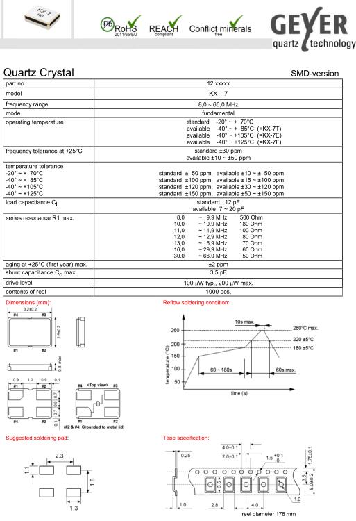 GEYER格耶晶振,KX-7高精度晶振,3225無源晶體,3225mm體積貼片晶振適用于汽車電子領(lǐng)域的表面貼片型石英晶振,本產(chǎn)品已被確定的高信賴性最適合用于汽車電子部件,晶體在極端嚴酷的環(huán)境條件下也能發(fā)揮穩(wěn)定的起振特性,晶振本身具有耐熱,耐振,耐沖擊等優(yōu)良的耐環(huán)境特性,滿足無鉛焊接的高溫回流溫度曲線要求,符合AEC-Q200標準.