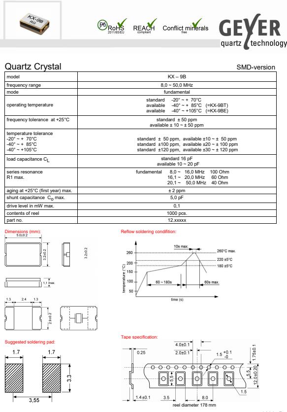 GEYER歐美晶振,KX-9B兩腳晶振,低損耗晶振,小型表面貼片晶振型,是標(biāo)準(zhǔn)的石英晶體振蕩器,適用于寬溫范圍的電子數(shù)碼產(chǎn)品,家電電器及MP3,MP4,播放器,單片機(jī)等領(lǐng)域.可對(duì)應(yīng)8.000MHz以上的頻率,在電子數(shù)碼產(chǎn)品,以及家電相關(guān)電器領(lǐng)域里面發(fā)揮優(yōu)良的電氣特性,滿足無鉛焊接的回流溫度曲線要求.