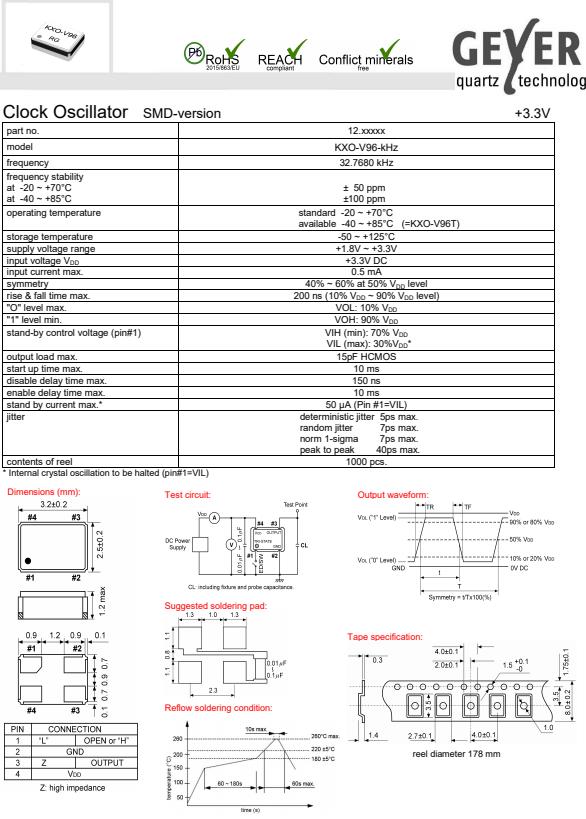 GEYER進口晶振,KXO-V96-kHz低抖動晶振,時鐘振蕩器,小體積SMD時鐘振蕩器,是貼片音叉晶體,千赫頻率元件,應用于時鐘模塊,智能手機,全球定位系統,因產品本身體積小,SMD編帶型,可應用于高性能自動貼片焊接,被廣泛應用到各種小巧的便攜式消費電子數碼時間產品,環(huán)保性能符合ROHS/無鉛標準.