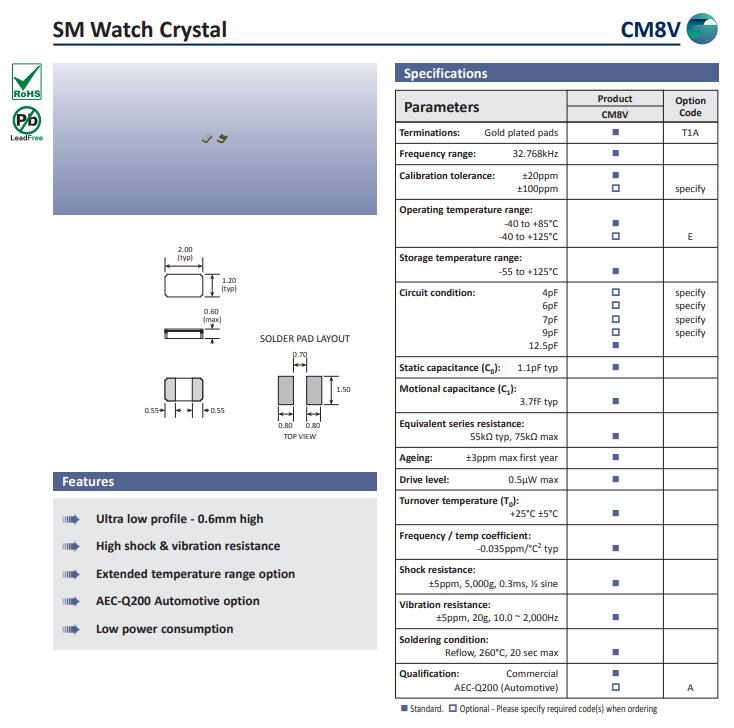 Golledge晶振,CM8V晶振,2012二腳晶振此款SMD晶體并且可以承受回流焊接的高溫,波峰焊接,回流焊接等,貼片表晶主要特點是該產(chǎn)品排帶包裝,焊接模式主要使用SMT焊接,給現(xiàn)代SMT工藝帶來高速的工作效率,32.768K系列產(chǎn)品本身具有體積小,厚度薄,重量輕等特點,此音叉型石英晶體諧振器,晶振產(chǎn)品本身具備優(yōu)良的耐熱性,耐環(huán)境特性,在辦公自動化,家電領(lǐng)域,移動通信領(lǐng)域可發(fā)揮優(yōu)良的電氣特性,符合無鉛標(biāo)準(zhǔn),滿足無鉛焊接的回流溫度曲線要求,金屬外殼的石英晶振使得產(chǎn)品在封裝時能發(fā)揮比陶瓷晶振外殼更好的耐沖擊性能.