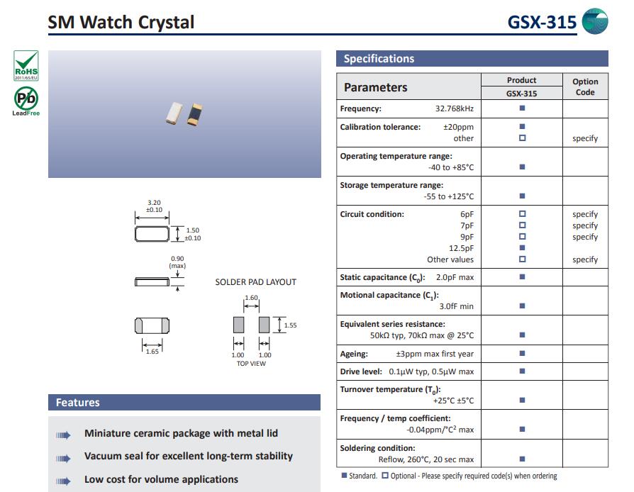Golledge晶振,GSX-315晶振,3215無源晶振小體積SMD時鐘晶體諧振器,是貼片音叉晶體,千赫頻率元件,應用于時鐘模塊,智能手機,全球定位系統(tǒng),因產品本身體積小,SMD編帶型,可應用于高性能自動貼片焊接,被廣泛應用到各種小巧的便攜式消費電子數(shù)碼時間產品,環(huán)保性能符合ROHS/無鉛標準.