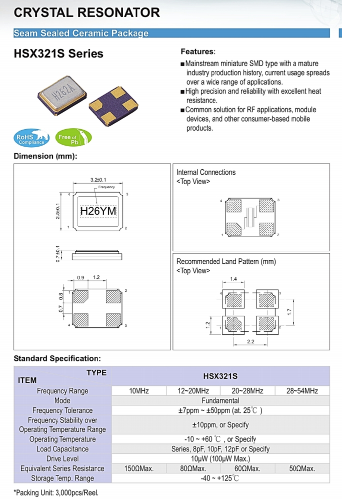 | X3S022000BK1H-U | HELE晶振 | HSX321S | 22.000MHZ | 20PF | ±10PPM | ±10PPM |