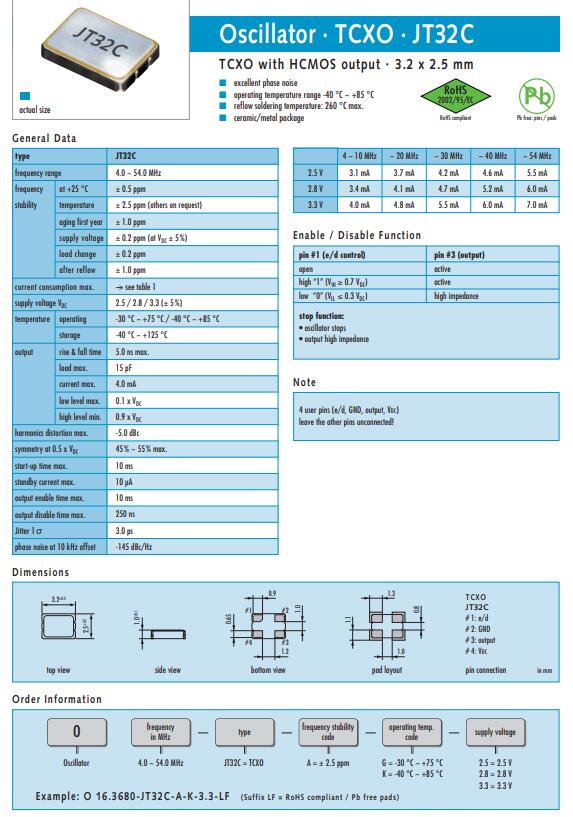 JUACH晶振,JT32C晶振,3225溫補晶振體積的溫補晶振(TCXO),是目前有源晶振中體積最小的一款,產(chǎn)品本身帶溫度補償作用的晶體振蕩器,該體積產(chǎn)品最適合于GPS,以及衛(wèi)星通訊系統(tǒng),智能電話等多用途的高穩(wěn)定的頻率溫度特性晶振.為對應(yīng)低電源電壓的產(chǎn)品.(DC+1.8V ± 0.1V to +2.9V ± 0.1V 對應(yīng)IC可能) 高度:最高0.8 mm,體積:0.0022 cm3,重量:0.008 g,超小型,輕型.低消耗電流,表面貼片型產(chǎn)品.(可對應(yīng)回流焊)無鉛產(chǎn)品.滿足無鉛焊接的高溫回流溫度曲線要求,帶有AFC(頻率控制)功能,Enable/Disable功能,產(chǎn)品本身可根據(jù)使用需要進行選擇.