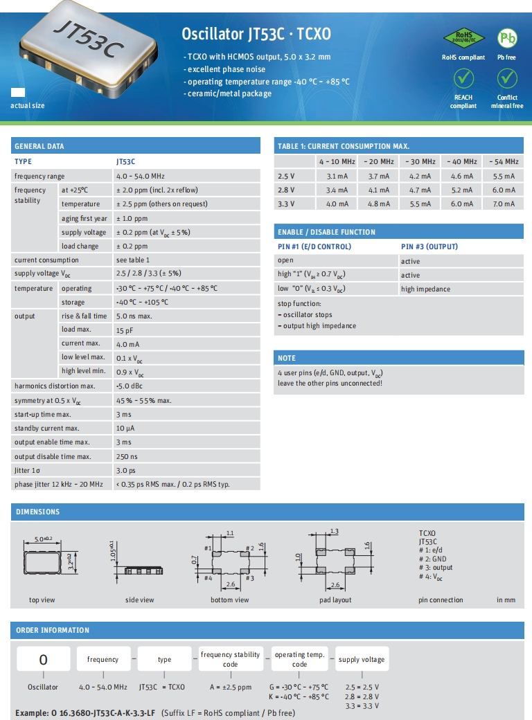 Jauch溫補晶振,O 26.0-JT53C-A-G-3.3-LF,6G移動無線電晶振規(guī)格表