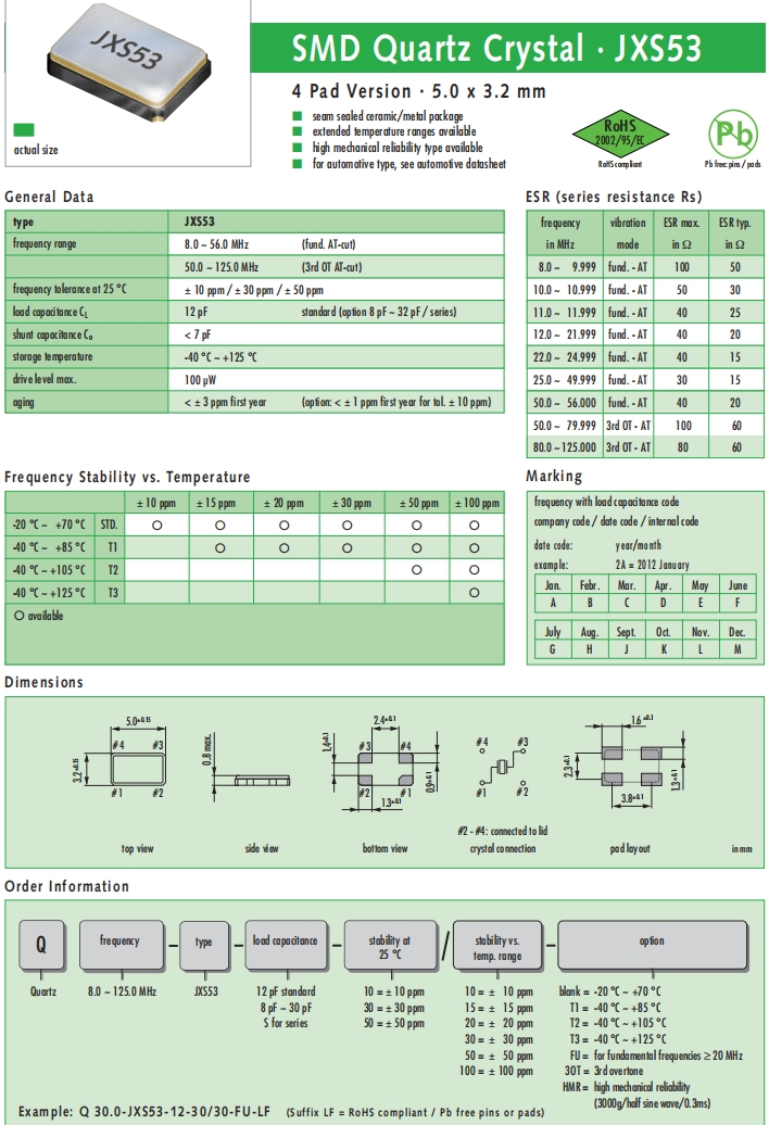 | Q 20.0-JXS22-12-10/10-FU-WA-LF | Jauch晶振 | JXS22-WA | 20MHz | ±10ppm | 12pF | -20°C ~ 70°C |