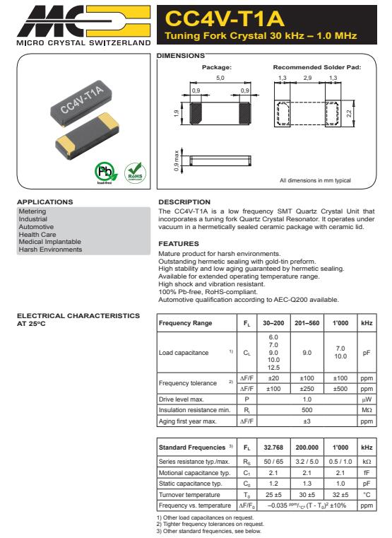 CC4V-T1A-32.768kHz-12.5pF-20ppm-TA-QC,5019mm石英晶振,6G以太網(wǎng)晶振,瑞士微晶晶振,CC4V-T1A無(wú)源晶振,CC7V-T1A-32.768kHz-12.5pF-20ppm-TA-QC晶振,5019mm石英晶體,SMD晶振,金錫預(yù)制件的出色密封保證了高穩(wěn)定性和低老化,適用于惡劣環(huán)境的成熟產(chǎn)品,頻率32.768KHz,負(fù)載12.5pF,6G以太網(wǎng)晶振,醫(yī)用植入式晶振,工業(yè)設(shè)備晶振.