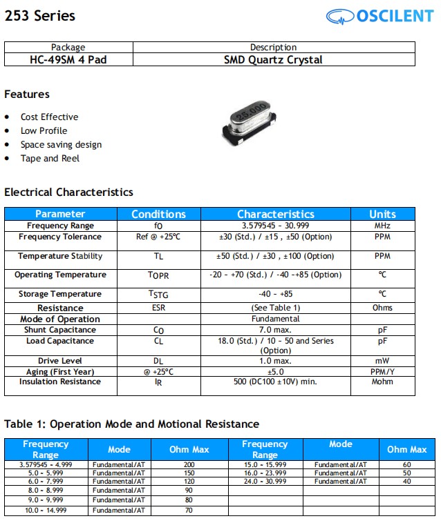 美國Oscilent晶振,253-25.0M-18-15GW-TR,6G低成本晶振規(guī)格表
