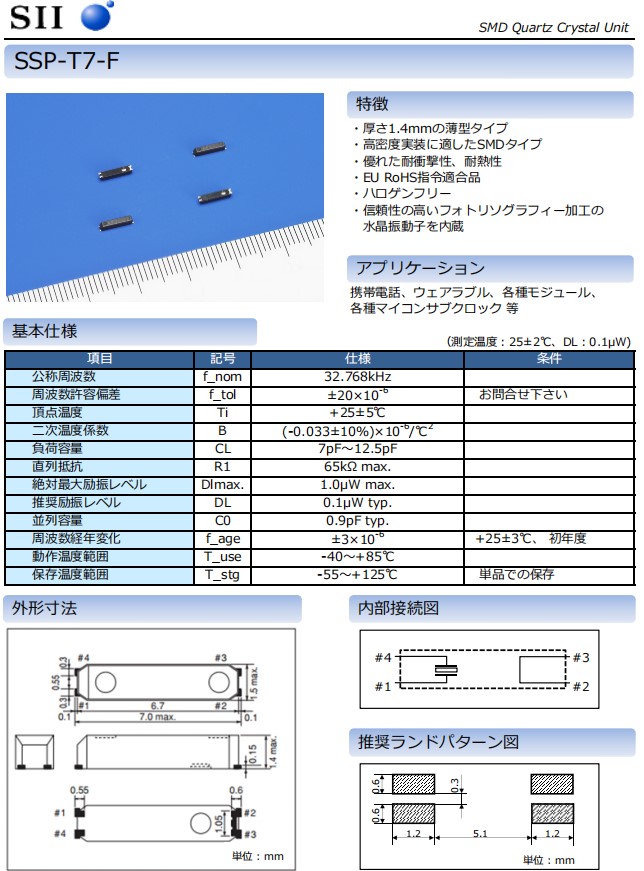 | Q-SPT7P032762070FF | Seiko Crystal | SSP-T7-F | kHz Crystal (Tuning Fork) | 32.768K晶振 |