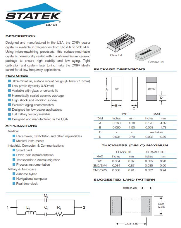 STATEK晶振將水晶放置玻璃封裝以及陶瓷蓋封裝內(nèi),人造水晶相較于其他使用機(jī)械生產(chǎn)的水晶要小的多.所生產(chǎn)水晶元件具有領(lǐng)先優(yōu)勢,具有以下特點(diǎn):高穩(wěn)定性,頻率精準(zhǔn),保存溫度范圍廣,抗老化性能強(qiáng)等特點(diǎn).Statek石英晶振,晶體振蕩器具有小型化,低功耗,優(yōu)秀的耐沖擊性,抗氧化性佳等特點(diǎn).廣泛使用于全球GPS定位系統(tǒng),WLAN網(wǎng)絡(luò)產(chǎn)品,網(wǎng)絡(luò)控制器,無線基站,程控交換設(shè)備,精密儀器,GPS衛(wèi)星,汽車應(yīng)用,計算機(jī),全球GPS定位系統(tǒng),無線通訊,數(shù)碼產(chǎn)品等等.