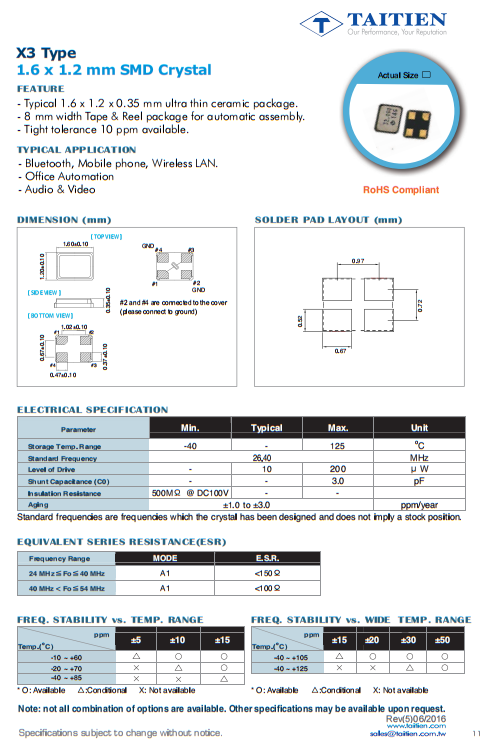 | X3AEELNANF-26.000000 | Taitien晶振 | X3 | 26MHz | ±30ppm | ±30ppm | 8pF | -40°C ~ 85°C |