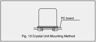 (3)安裝引線型晶振晶體單元時(shí),我們建議設(shè)備應(yīng)與PC聯(lián)系電路板和焊接方式,以防止疲勞和由于機(jī)械共振引起的引線斷裂(見圖。13)。