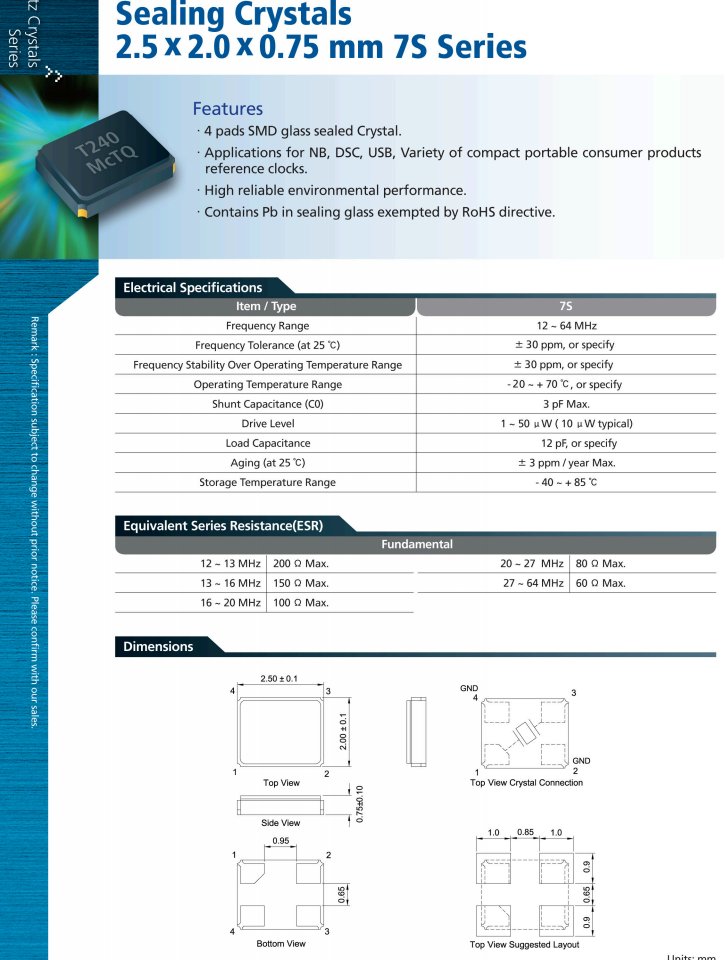 | 老化 | ± 3 ppm / year Max. |