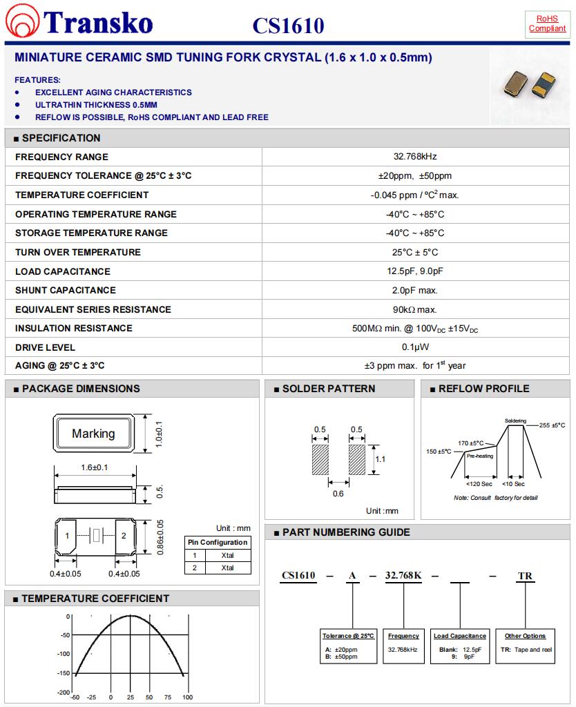 特蘭斯科晶振,CS1610-A-32.768K-TR,6G基站晶振規(guī)格表