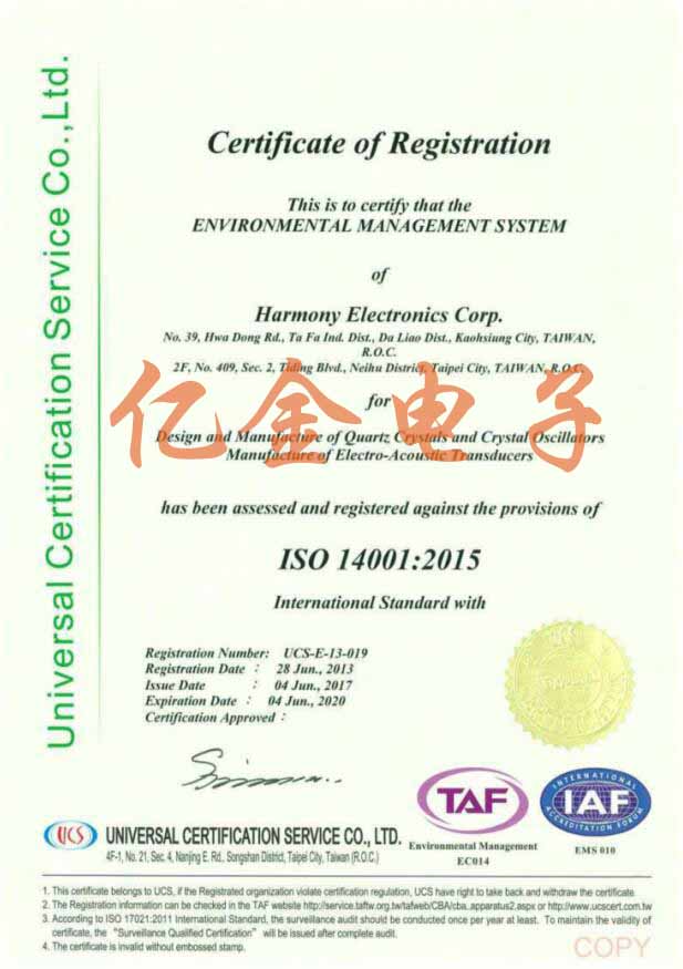 2015年加高晶振ISO14001標(biāo)準(zhǔn)認(rèn)證