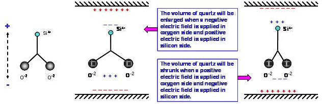 石英材料中的二氧化硅分子(SiO2) 在正常狀態(tài)下, 其電偶極是互相平衡的電中性. 在(圖二左)的二氧化硅是以二維空間的簡化圖形. 當(dāng)我們在硅原子上方及氧原子下方分別給予正電場及負(fù)電場時, 空間系統(tǒng)為了維持電位平衡, 兩個氧原子會相互排斥, 在氧原子下方形成一個感應(yīng)正電場區(qū)域, 同時在硅原子上方產(chǎn)生感應(yīng)負(fù)電場區(qū)域. 相反的情況, 當(dāng)我們在硅原子上方及氧原子下方分別給予負(fù)電場及正電場時, 兩個氧原子會相互靠近, 氧原子下方產(chǎn)生感應(yīng)負(fù)電場,硅原子上方產(chǎn)生感應(yīng)正電場.
