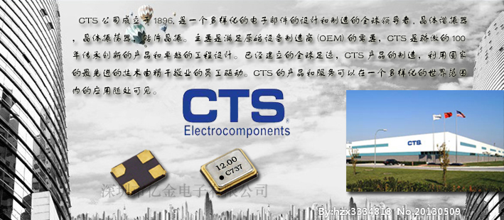 CTS是一家集晶體的研發(fā)、生產、銷售為主的晶振廠家.產品應用范圍包含行動電話、平板電腦、衛(wèi)星通訊、車載系統(tǒng)、全球定位系統(tǒng)、個人電腦、無線通信及家用產品等,扮演基本信號源產生、傳遞、濾波等功能.持續(xù)致力于技術研究開發(fā)及品質落實扎根,營運據(jù)點遍布臺灣、中國大陸、日本、新加坡、美國及歐洲等世界各地,使希華得以提供服務予世界電子大廠.