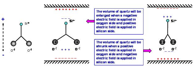 石英材料中的二氧化硅分子(SiO2) 在正常狀態(tài)下, 其電偶極是互相平衡的電中性. 在(如圖)的二氧化硅是以二維空間的簡化圖形. 當我們在硅原子上方及氧原子下方分別給予正電場及負電場時, 空間系統(tǒng)為了維持電位平衡, 兩個氧原子會相互排斥, 在氧原子下方形成一個感應正電場區(qū)域, 同時在硅原子上方產生感應負電場區(qū)域. 相反的情況, 當我們在硅原子上方及氧原子下方分別給予負電場及正電場時, 兩個氧原子會相互靠近, 氧原子下方產生感應負電場,硅原子上方產生感應正電場. (如圖). 然而, 氧原子的水平位置變化時,迫使氧原子回到原來的空間位置. 因此, 電場的力量與原子之間的力量會相互牽動, 電場的改變與水平方向的形變是形成交互作用狀態(tài).