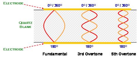 在AT切割角度的石英晶體共振子主要是以厚度剪切振蕩模態(tài)存在. 石英晶體在共振時(shí), 除了基本波振蕩之外, 高階的倍頻共振也與基本波振蕩同時(shí)存在于石英晶體的電極區(qū)域之間. 但是, 由于壓電材料的電極是電氣相位相反的振動環(huán)境, 所以, 祇有奇數(shù)倍(odd number)的高頻倍頻可以發(fā)生, 偶數(shù)倍(even number)的倍頻共振在石英晶體共振子是不會存在的(左圖).