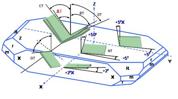 依據(jù)不同的應(yīng)用領(lǐng)域及工作溫度需求, 因應(yīng)了許多不同的石英切割角度種類. 例如AT-, BT-, CT-, DT-, NT, GT…..等不同的切割板片. 不同的切割方向的板片具有不同的彈性常數(shù)張量, 不同的壓電常數(shù)張量(piezoelectric constant tensor)及不同的介電常數(shù)張量(dielectric constant tensor). 這些張量在石英組件的設(shè)計及應(yīng)用上展現(xiàn)了不同的振蕩及溫度特性. (如圖)表現(xiàn)了在Z-plat石英結(jié)構(gòu)上,幾種不同方向的石英板片切割方式.