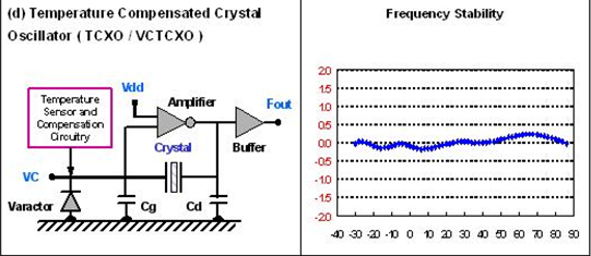 為了滿足應(yīng)用面需求而言, 石英晶體振蕩器內(nèi)部的振蕩線路有以基本波或三倍頻不同方式. 若要達到數(shù)佰兆赫的輸出頻率時, 振蕩線路后級可以采用鎖相回路方式或倍頻方式, 將較低頻率的石英振蕩頻率提升. 對于輸出端的輸出準位及輸出波形也有各類不同需求,如CMOS, LVPECL, LVDS…..等. 這些規(guī)格都要仔細的定義.在(如圖)提供了數(shù)種石英振蕩器輸出頻率對溫度變化的穩(wěn)定性示義圖.