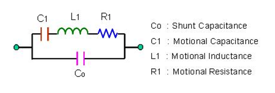 就是將石英晶體共振子轉(zhuǎn)換成振蕩頻率附近的Butterworth-Van Dyke (BVD)等效電路. 在這個圖中, 有四個主要參數(shù) : 靜態(tài)電容-Co, 動態(tài)電容-C1, 動態(tài)電感-L1及動態(tài)電阻-R1.