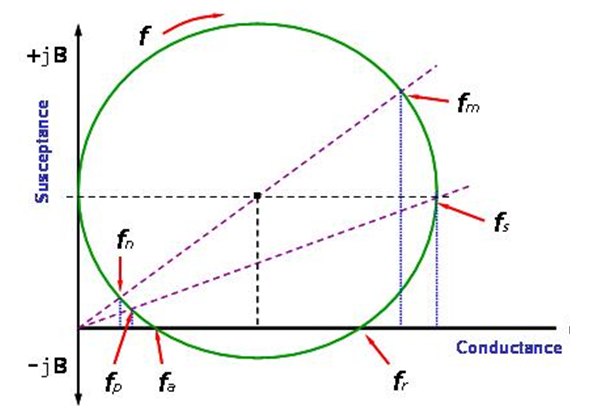 最大電導(dǎo)頻率及最小電導(dǎo)頻率 ( fm , fn )(maximum admittance frequency minimum admittance frequency).這三組頻率的導(dǎo)納(admittance)圖, 可以從(如圖)復(fù)數(shù)坐標(biāo)清楚的看到串聯(lián)偕振頻率及并聯(lián)偕振頻率, fs and fp ,是分別由電導(dǎo)(real part of the admittance)最大和阻抗(real part of the electric input impedance)最大時(shí)的頻率.諧振頻率及反諧振頻率, fr and fa , 分別是當(dāng)電導(dǎo)等于零(純電阻特性)的二個(gè)頻率. 在這個(gè)時(shí)候, fr 的阻抗為 1 / Rr 而fa 的阻抗為 1/ Ra.