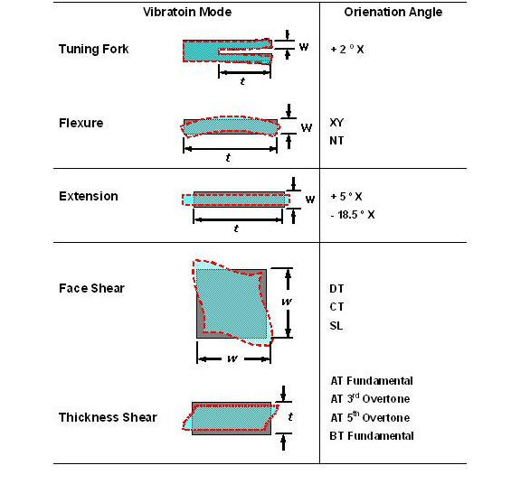 經(jīng)由不同的石英切割角度及不同電極型狀的電場(chǎng)效應(yīng), 石英芯片展現(xiàn)了各種不同的振動(dòng)模態(tài). 以經(jīng)常產(chǎn)生的振動(dòng)模態(tài)可以概分為擾曲模態(tài)(flexure mode), 伸縮模態(tài)(extension mode), 面剪切模態(tài)(face shear mode) 和 厚度剪切模態(tài)(thickness shear mode). 這幾種振動(dòng)模態(tài)以簡(jiǎn)單的方法在表一中可以看到. 在實(shí)際狀況中, 石英芯片并不是一定祇有單一種振動(dòng)模態(tài), 而可能有多種模態(tài)同時(shí)存在在一個(gè)石英芯片的振蕩中, 經(jīng)由適當(dāng)?shù)脑O(shè)計(jì), 可以壓制其它不希望產(chǎn)生的振動(dòng)模態(tài)(unwanted mode), 來達(dá)到主要振動(dòng)模態(tài)的最佳化.