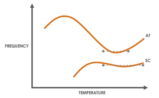 • 更高的工作溫度:SC 切割晶體的轉(zhuǎn)折點(diǎn)高于 AT 切割晶體,使其成為烘箱應(yīng)用的理想選擇。這種較高轉(zhuǎn)折點(diǎn)的缺點(diǎn)是在較低溫度下急劇下降。由于這一特性,SC 切割晶體僅適用于恒溫振蕩器,在其他振蕩器配置(TCXO、VCXO 等)中無法正常工作。