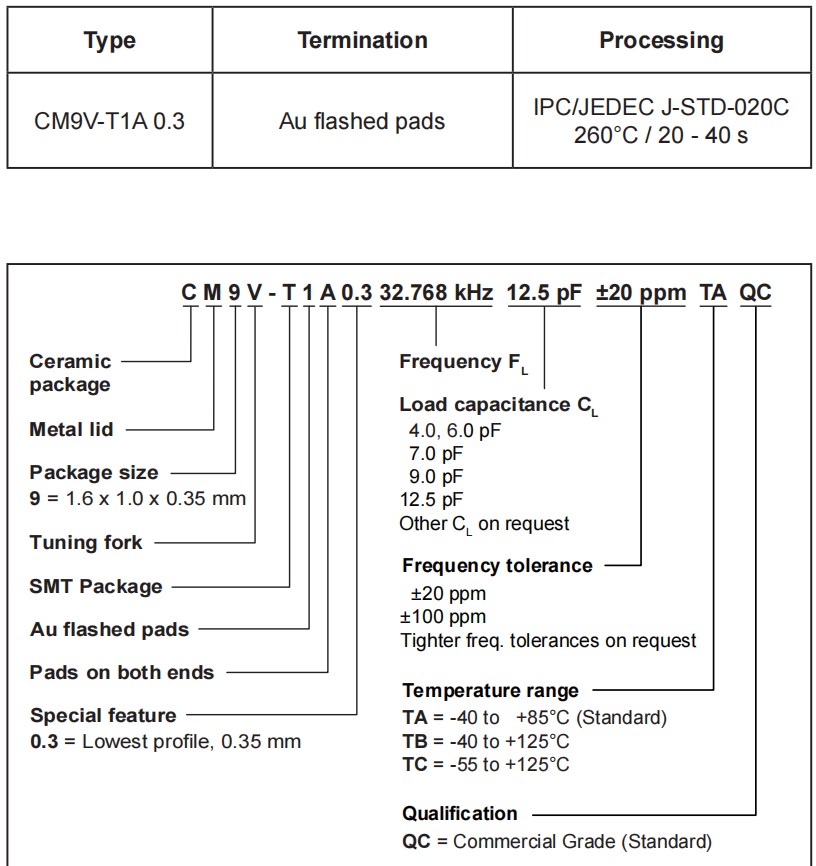 | Micro Crystal | CM9V-T1A-32.768kHz-12.5pF-20PPM-TA-QC | 32.768 kHz 12.5 pF +/-20 PPM -40/+85C | 32.768 kHz |