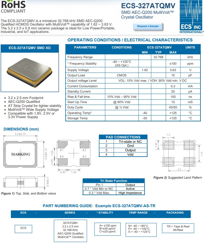 ECS-327ATQMV是一款32.768kHz低功耗、符合AEC-Q200標(biāo)準(zhǔn)的multi volt SMD石英晶體振蕩器。緊湊型陶瓷封裝3.2x2.5x0.9毫米(LWH)采用工業(yè)標(biāo)準(zhǔn)尺寸。MultiVolt特性允許客戶將同一器件用于多種設(shè)計,降低認(rèn)證要求,并減少庫存。ECS-327ATQMV是微型32.768kHz SMD AEC-Q200合格的HCMOS振蕩器,MultiVolt能力為1.62~3.63V。3.2x2.5x0.9mm陶瓷封裝非常適合低功耗/便攜式、工業(yè)和物聯(lián)網(wǎng)應(yīng)用。