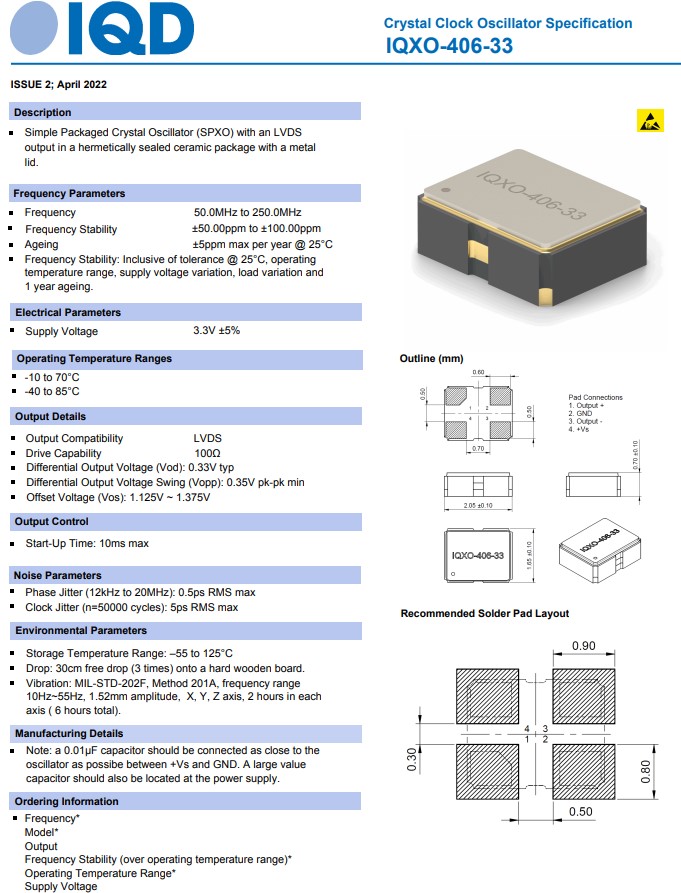 超小型LVDS晶振IQXO-406-33用于光纖通道設備,IQD晶振對更小、更高性能和更可靠的電子解決方案的需求不斷增長。這促使頻率產(chǎn)品制造商生產(chǎn)更小、更高頻率的器件,以達到設計目標并支持縮小PCB尺寸。與CMOS邏輯信號相比,LVPECL和LVDS輸出提供“互補對”邏輯,石英晶體振蕩器有助于在更高頻率下降低噪聲。新型時鐘振蕩器提供2.5 V或3.3 V兩種電壓,相位抖動小于0.5 PS RMS(12 kHz至20 MHz范圍內(nèi)),與指定輸出無關(guān).