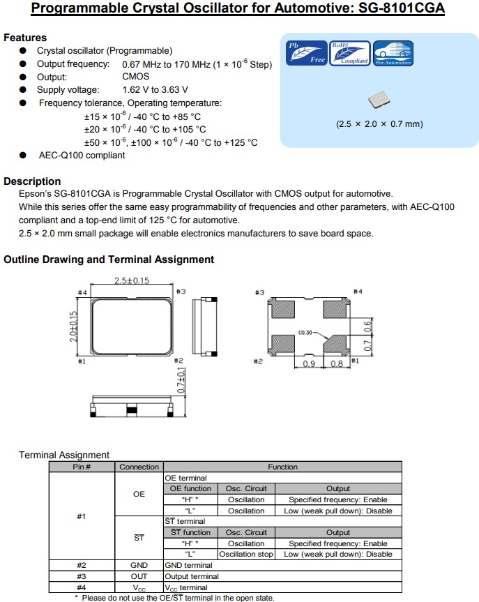 愛普生晶振SG-8101CGA是用于汽車的CMOS輸出可編程晶體振蕩器。 雖然這一系列提供了同樣容易編程的頻率和其他參數(shù),與AEC-Q100符合汽車應(yīng)用的125℃上限。小體積尺寸2.5x2.0mm四腳貼片晶振,小封裝將幫助電子制造商節(jié)省電路板空間,頻率范圍-0.67MHz至170MHz(1ppm步進(jìn)),電源電壓-1.62V至3.63V,功能-輸出使能(OE)或待機(jī)(ST),被廣泛用于汽車電子應(yīng)用,音響、藍(lán)牙、雷達(dá)、時(shí)鐘、顯示屏,智能手機(jī),物聯(lián)網(wǎng)等。