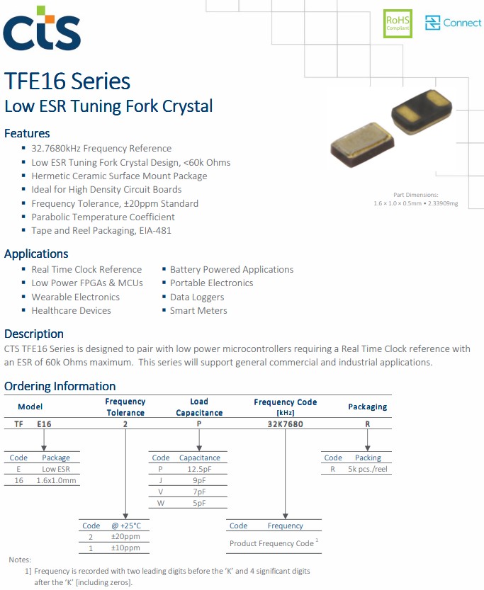 CTS晶振TFE16系列提供實時時鐘參考,TFE162P32K7680R,時鐘晶體諧振器